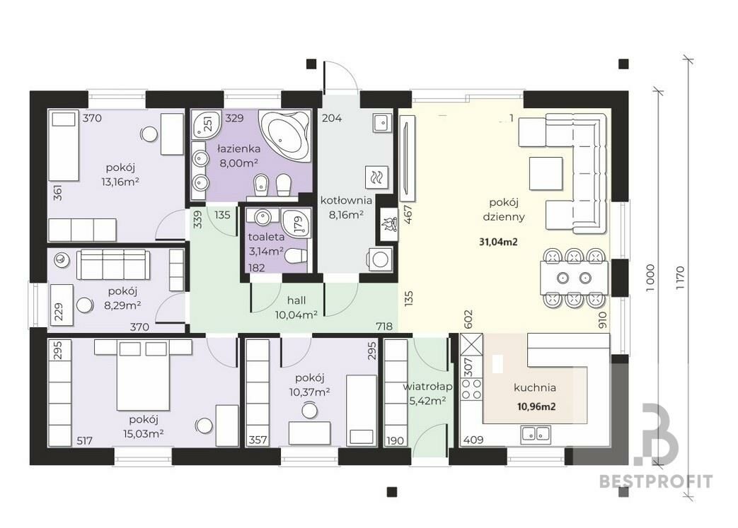 * 4 niezależne sypialnie o powierzchniach (10,37m2; 15,03m2; 8,29m2; 13,16m2),